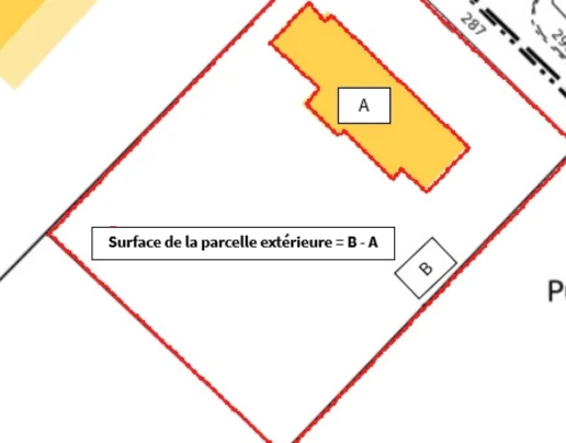 La surface extérieure correspond à la surface totale de la parcelle moins la taille de l'emprise au sol du bâti.